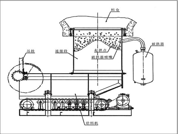 自動破拱給料機(jī)為了防止在給料機(jī)距離倉口較高的時候,連接段內(nèi)的物料壓實(shí)粘結(jié)成拱或粘壁,使物料不能從連接段內(nèi)排出或減少連接段的有效容量,因此采用了在連接段上安裝PF系列破拱器。自動破拱給料機(jī)利用壓縮空氣時瞬間產(chǎn)生的爆破力,對物料產(chǎn)生爆破、切割效應(yīng),以達(dá)到良好的疏通效果。